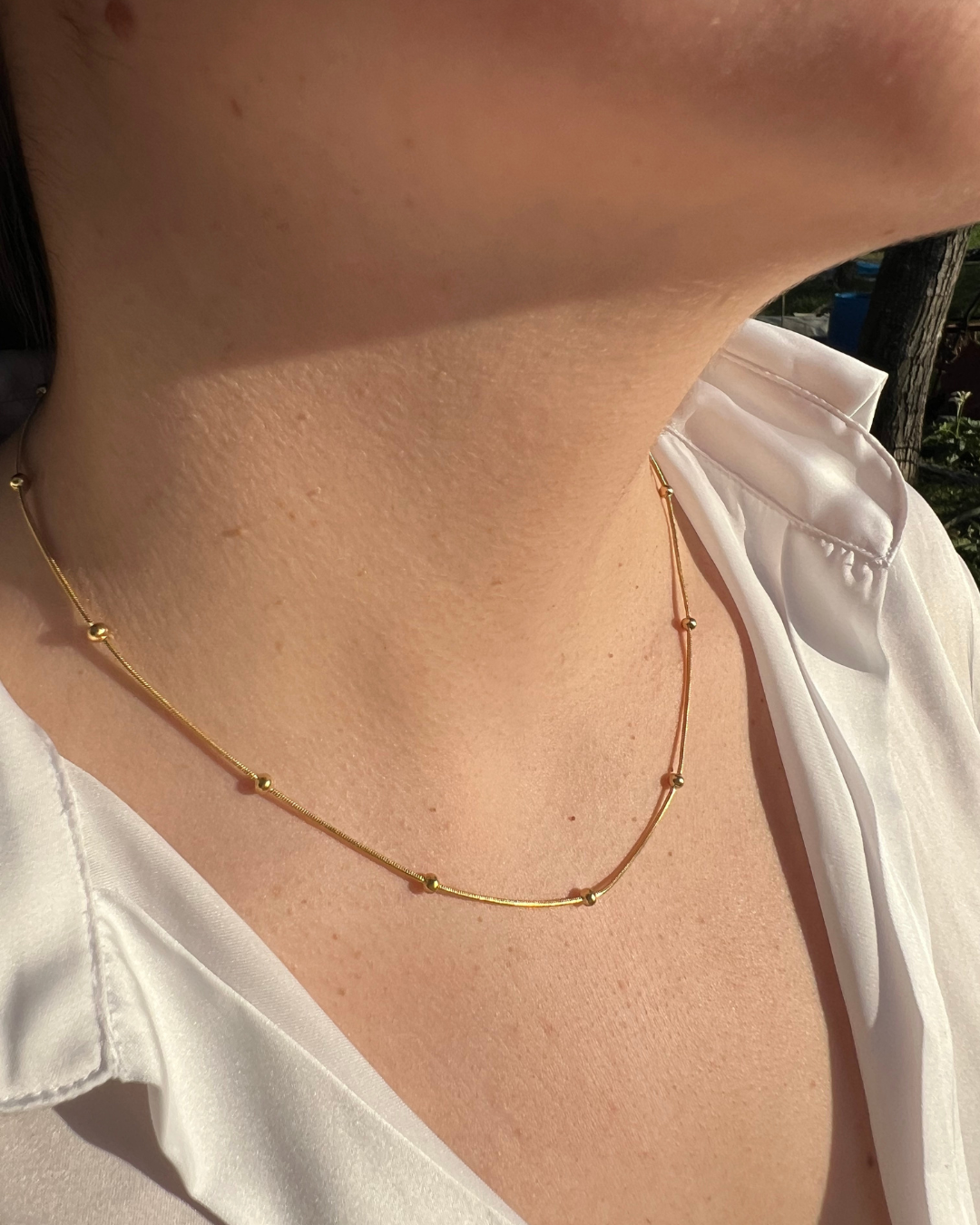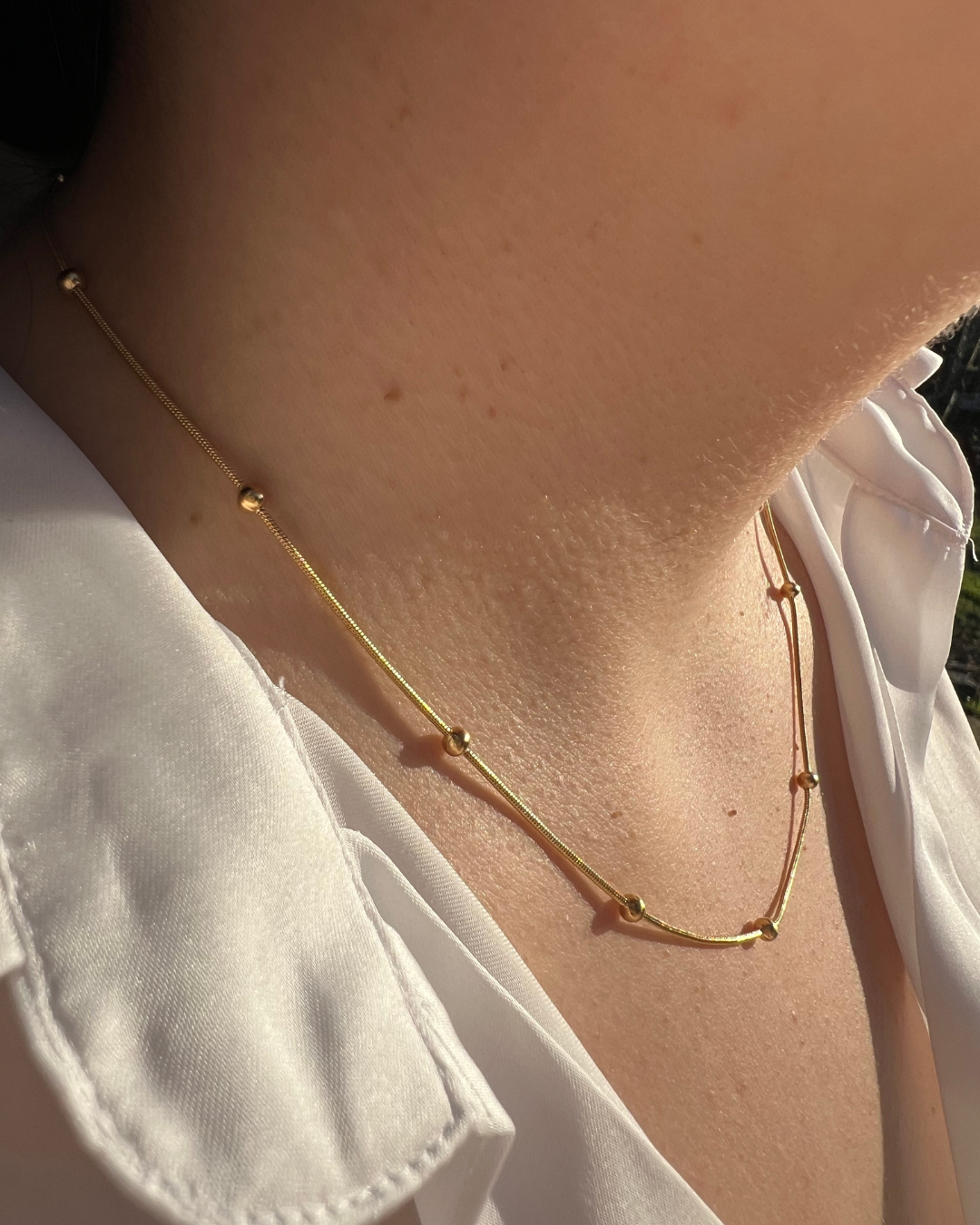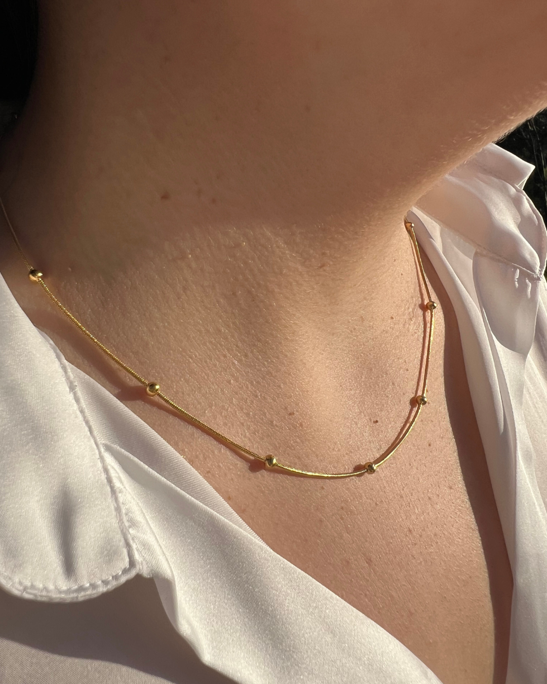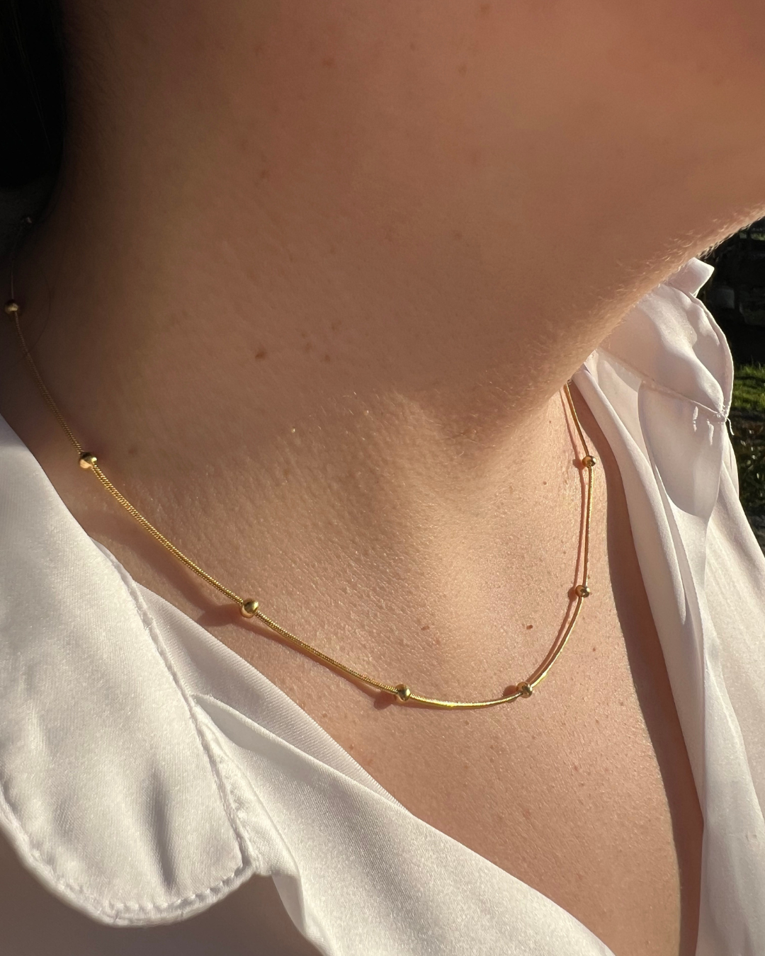 Minimalista e delicado, o Colar Aura combina sofisticação e leveza com suas pequenas esferas douradas ao longo da corrente. Perfeito para um look elegante e versátil, seja sozinho ou em camadas. Feito em aço inoxidável, resistente à água e pensado para brilhar contigo todos os dias!